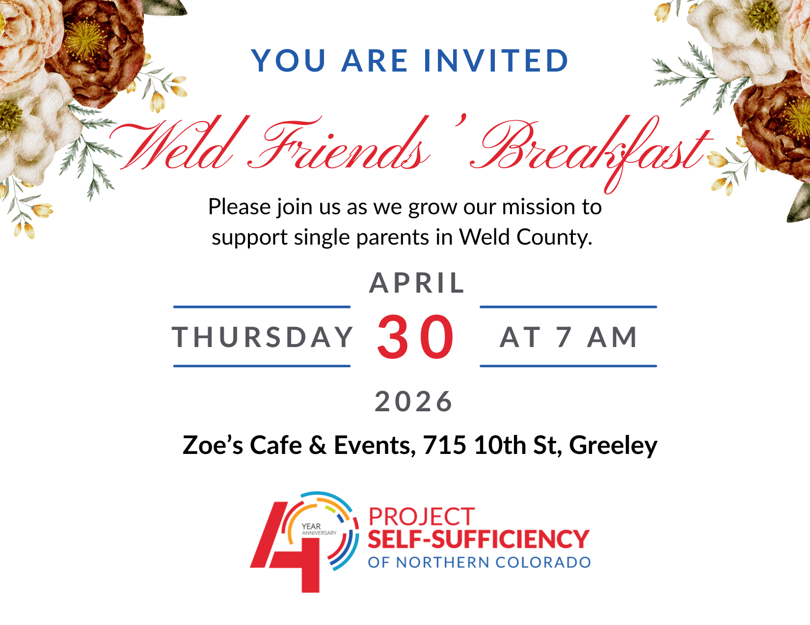 On April 30th, from 7am-9am, at Zoe’s Cafe and Events in Greeley, Project Self-Sufficiency will be hosting our annual Weld Friends’ Breakfast! Join us for breakfast, fellowship and networking while supporting single parents in Weld County on their journey toward self-sufficiency. The event is free to attend and will feature a breakfast buffet followed by a single parent sharing their lived experience of being a program participant and concluding with a mission moment and networking.